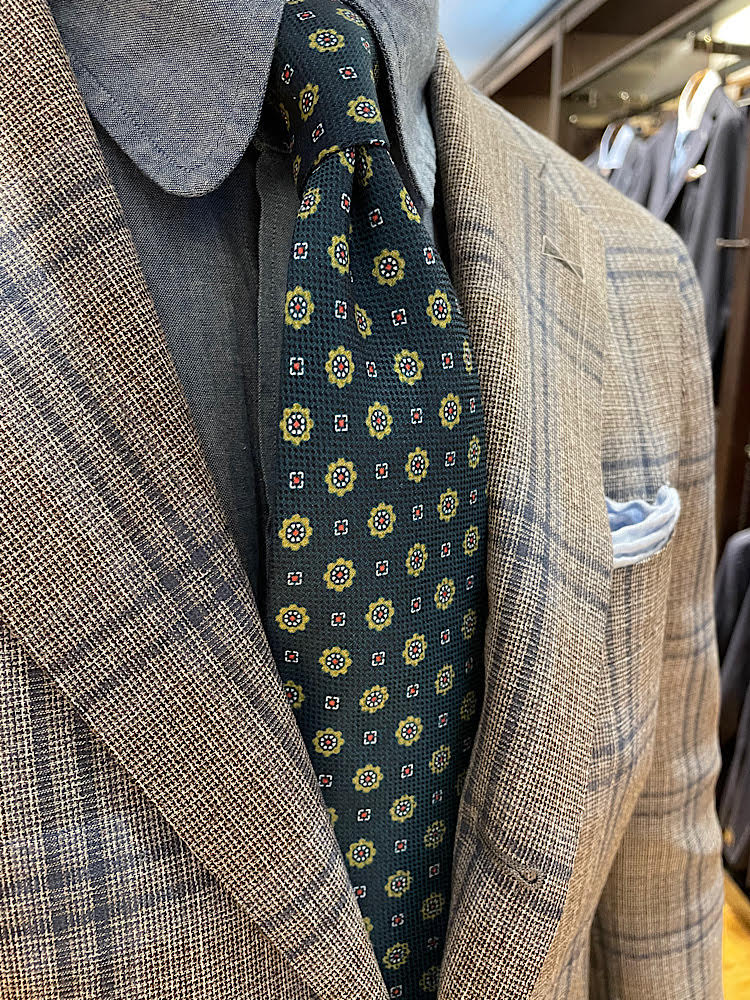 グレージュカラーにブルーのウィンドウペーンが爽やかな印象のジャケット。一見派手なようですが、他アイテムで色のトーンを抑えると、全体がまとまる印象に。