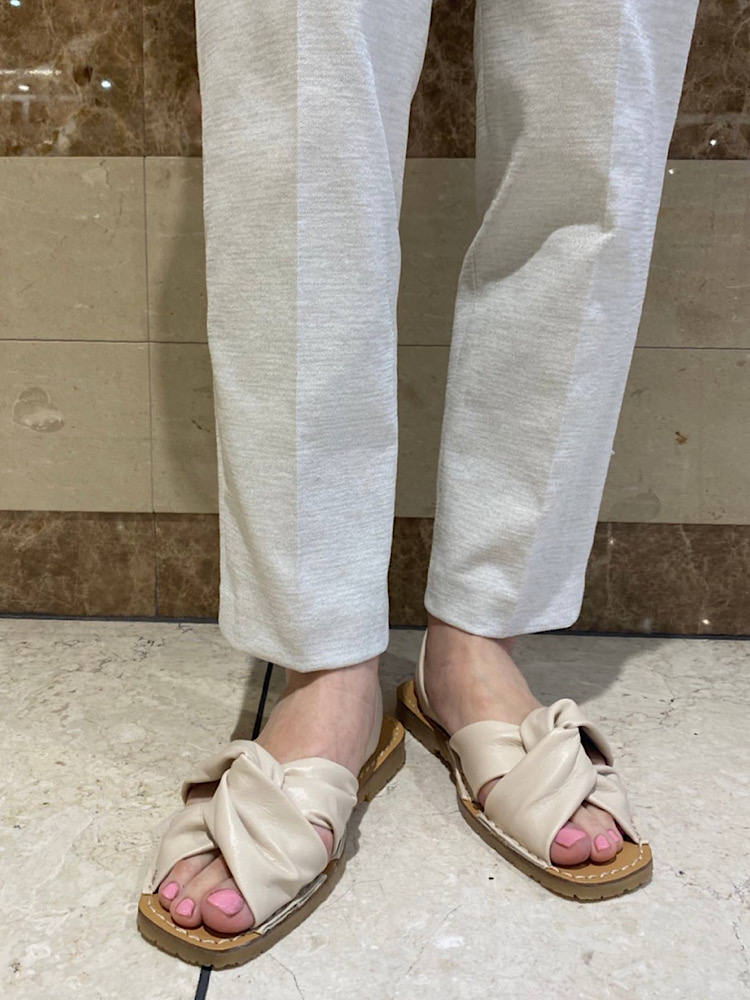 素材感・着心地:ポリエステルにコットンと麻混で伸縮性はしっかりありつつ張りのある素材感。シャリ感ある素材で涼しく着て頂けます。