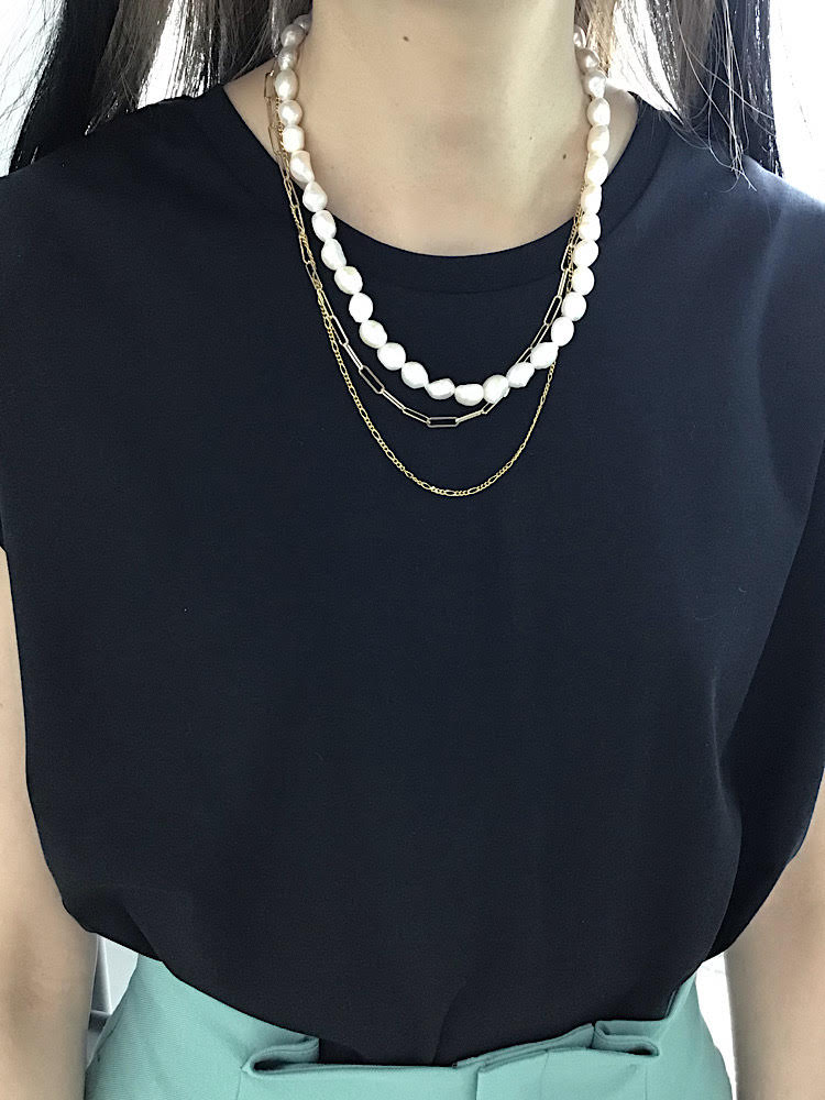 これから暑くなる季節に、涼しく着れるコーディネイトにしました。ネックレスの重ね付けを、アクセントにしています。