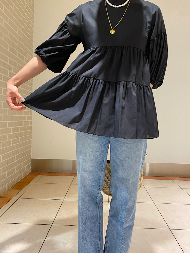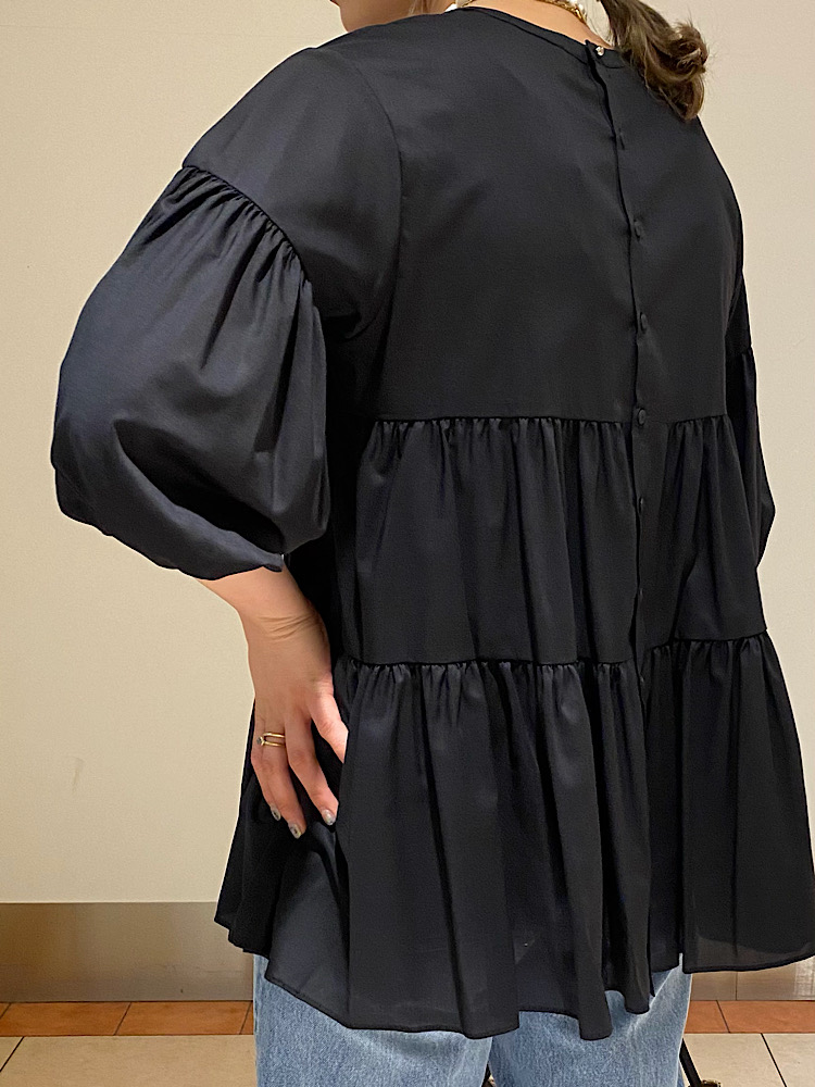 シンプルだが、ティアードと、ボリュームスリーブが女性らしいデザイン。