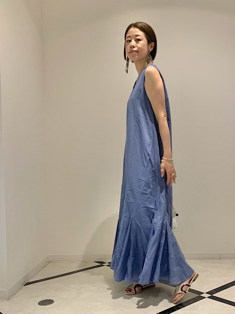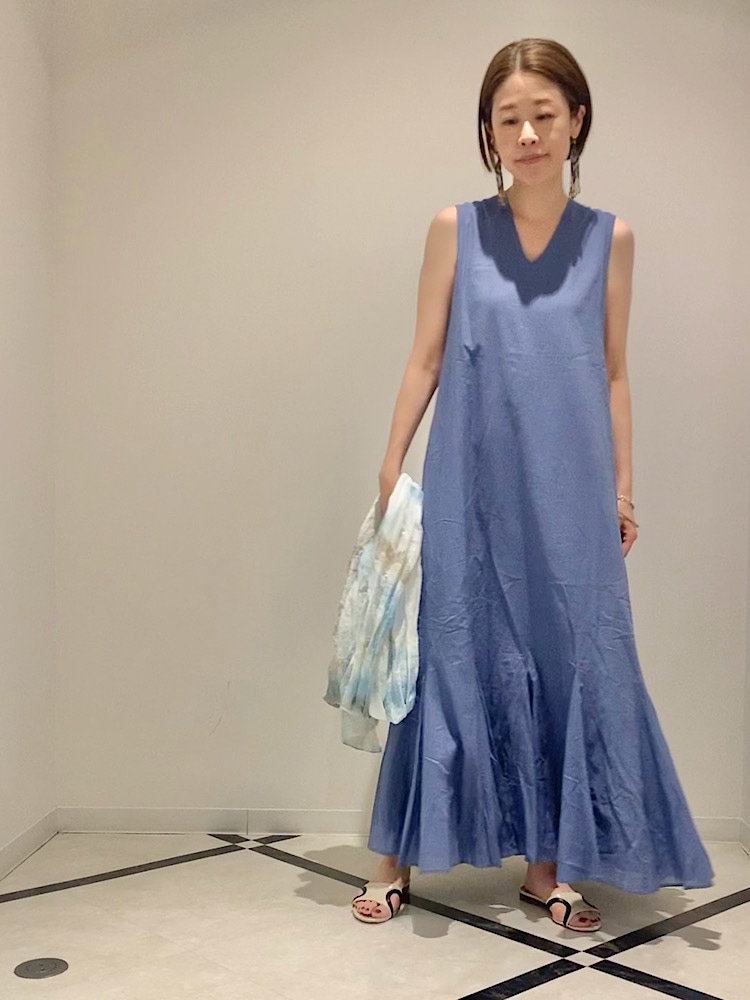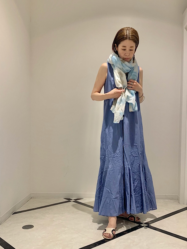 【素材感・着心地】清涼感のある綿素材。ロング丈でフレアシルエットだが軽く涼しい。