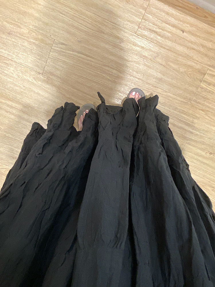 153cmでくるぶし丈の長さです。トップス部分は多少ぴったりとしたシルエットです。