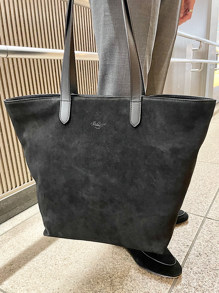 程よい大きさのトートで使いやすいです。表革とスエードのコンビで上品ながら、カジュアルな印象です。裏に鋲が付いているので、床置きしても自立します。