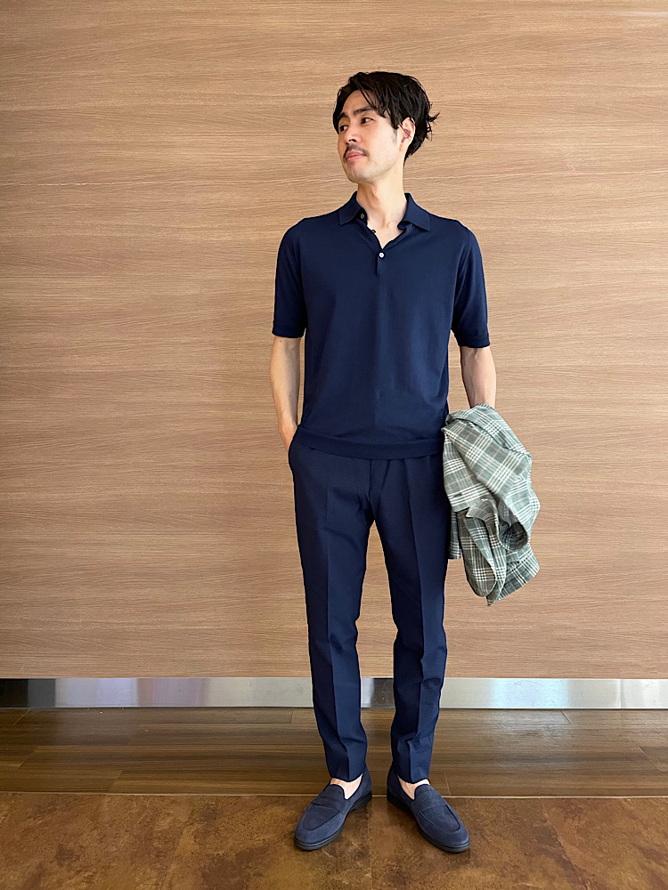 シアサッカー生地ですが適度にドレッシーさがあるためジャケットとの合わせもはまります。