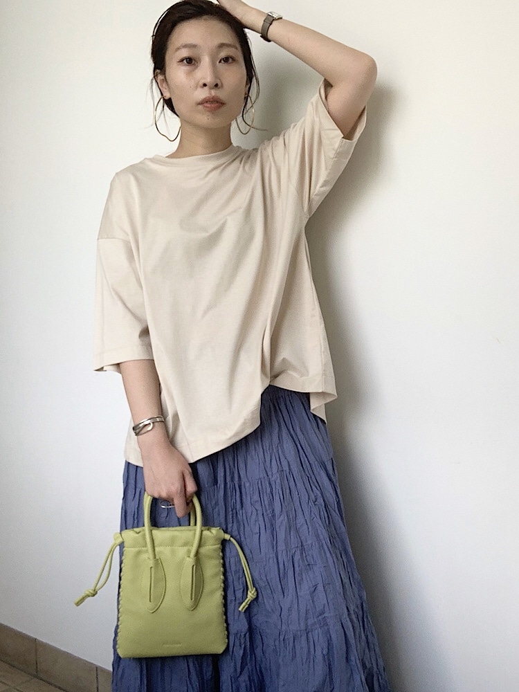 素材感・着心地:光沢感があり、綺麗めに合うカットソー。バックスリットが入っているデザインはワンポイント。
