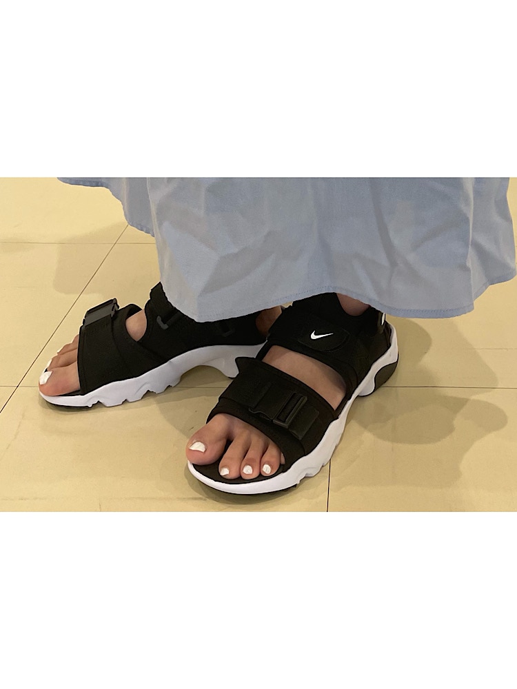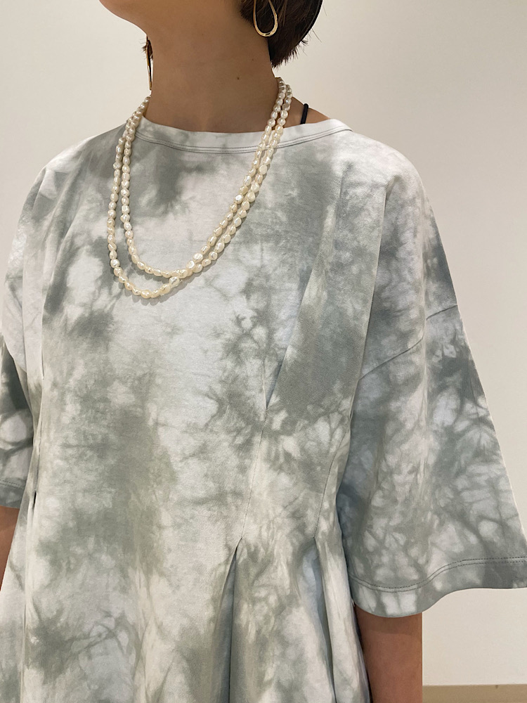タイダイ柄のカットソーをアクセントに爽やかなブルーが清涼感あるキャミワンピのスタイリングです。