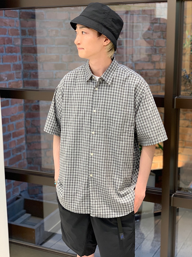 ギンガムチェックのシャツをダークトーンでスタイリングして足元をサンダルで抜け感を出しました。