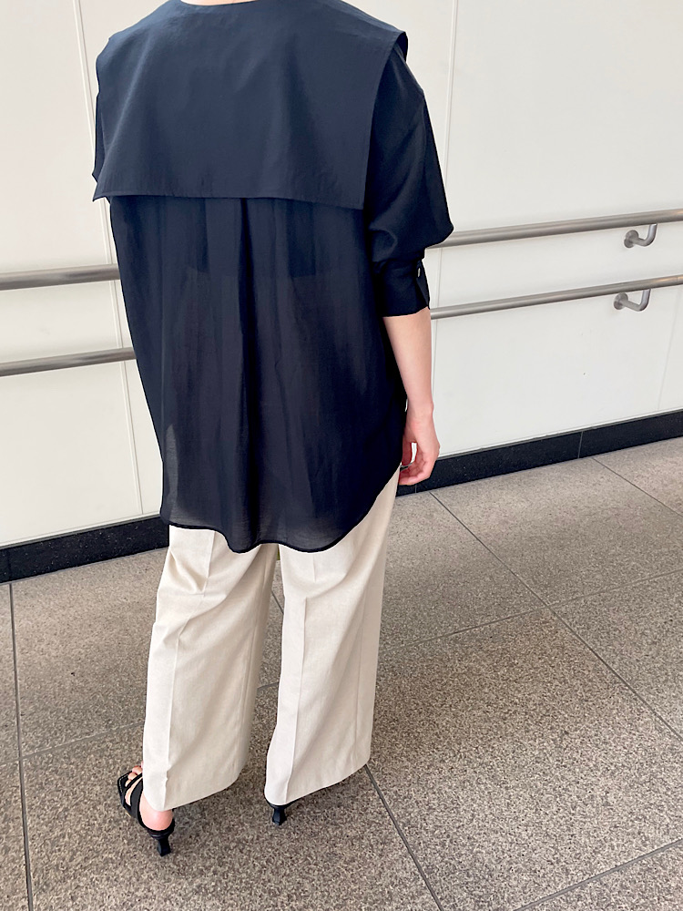 サイズ感 :ふんわりとゆとりあるサイズ感。つけ衿を外してノーカラーにすると程よい開きで窮屈せず着られます