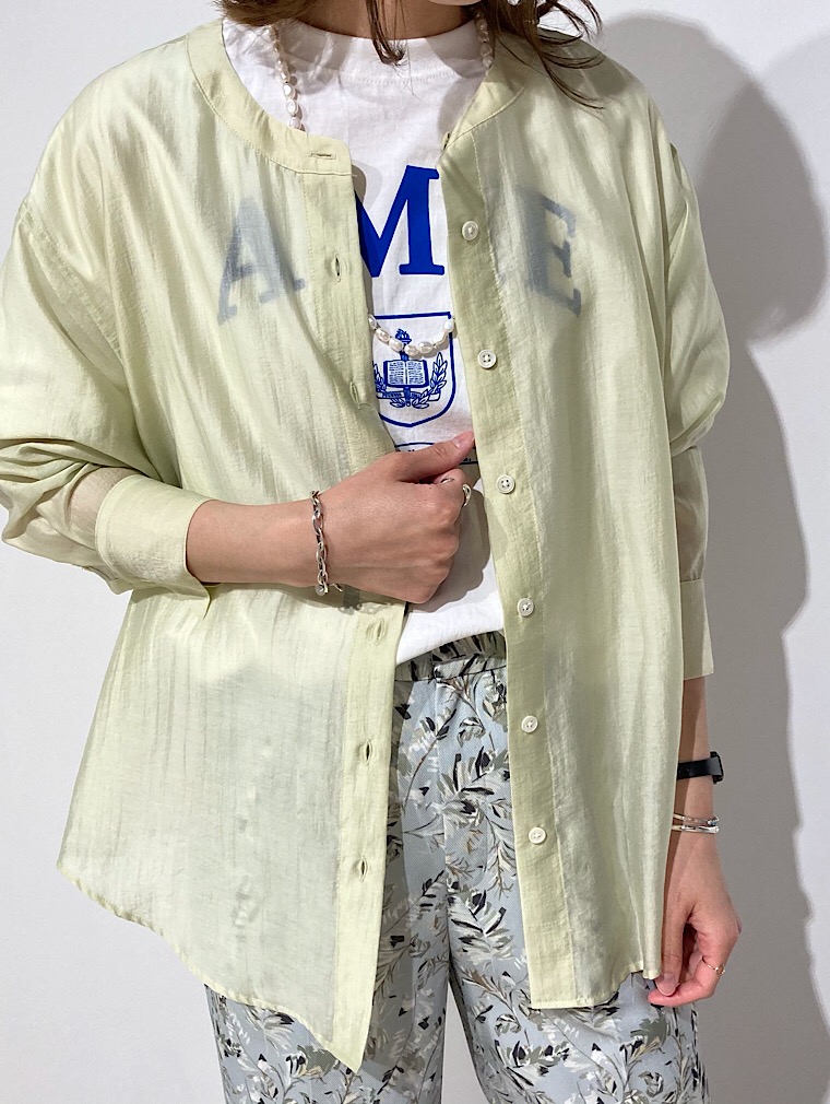 【素材感・着心地】透けすぎず、大人なシアーシャツ。光沢感もあるので1枚で主役になります。大ぶりなデザイン襟なので大人っぽい印象です。