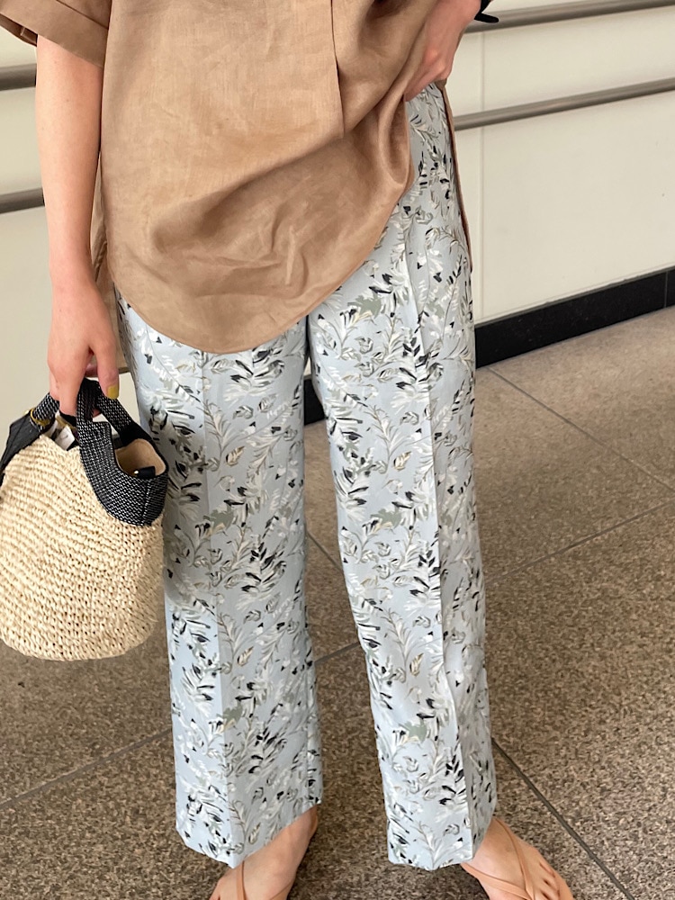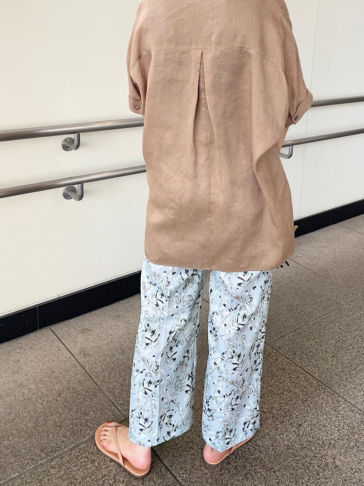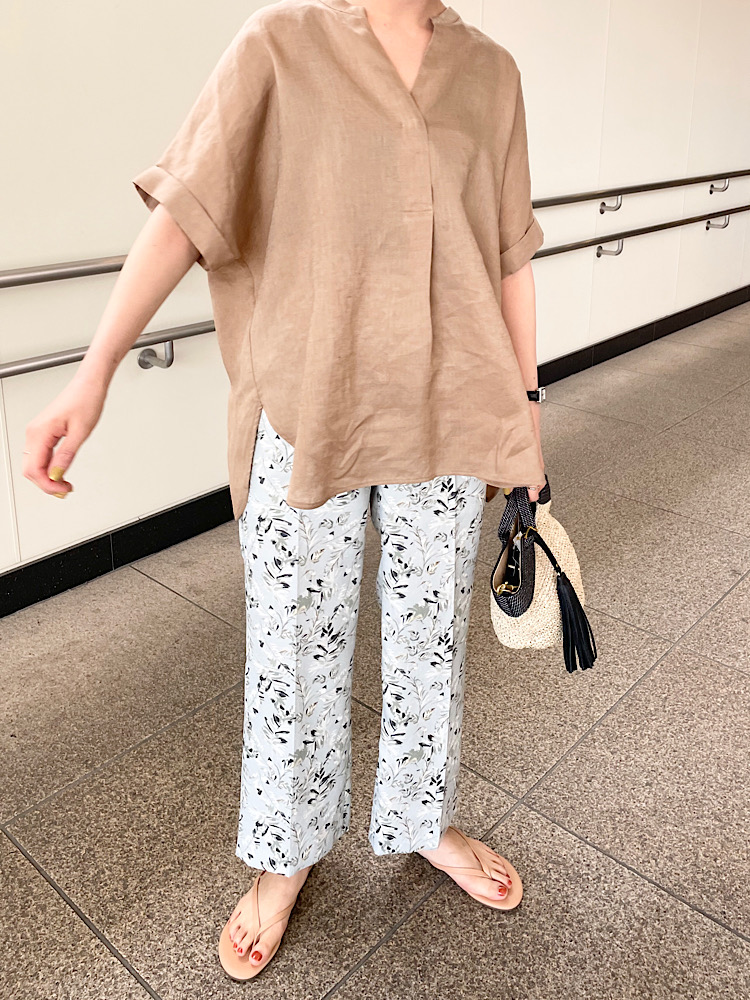 スキッパーのリネンブラウスをリーフ柄のタックパンツと合わせリゾートカジュアルなコーデに。