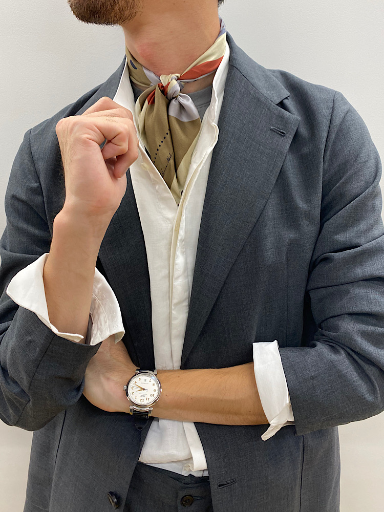 おすすめポイント:わかる人にはわかる、バウハウスの柄がなんともモダンな印象のスカーフ。男性がスカーフ、、と付けなれない方が多い中、ファッション業界の方は非常に重宝しているファッションアイテムです。恥ずかしがらず是非取り入れて頂きたいアイテムの一つです!!