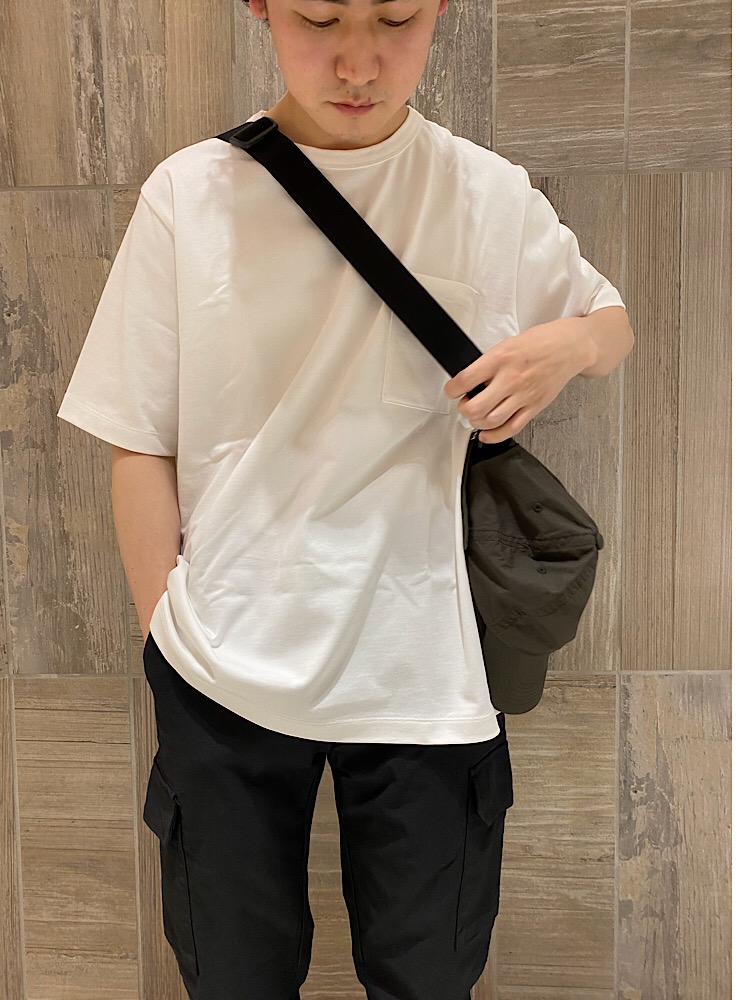【素材感・着心地】ニットブランドのカットソーの為、肌触りがかなり良い。サイズ感がゆったりめで、バインダーネック採用の為、1枚で着ても様になる。