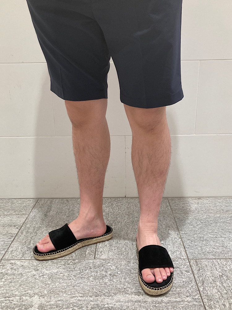 【素材感・着心地】シアサッカー生地なので、肌触りもサラサラしていて、通気性も良いため、夏に最適。ウエストはややゆったりめだが、ゴムと紐があるので楽に履ける。