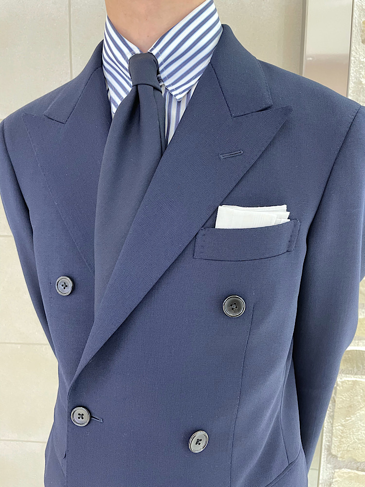 一見ベーシック。ただ、梳毛とも紡毛ともつかない風合いのスーツに、鈍い光沢がさりげない品を醸し出すウールタイ、そこをタブカラーのシャツで立体的に演出。