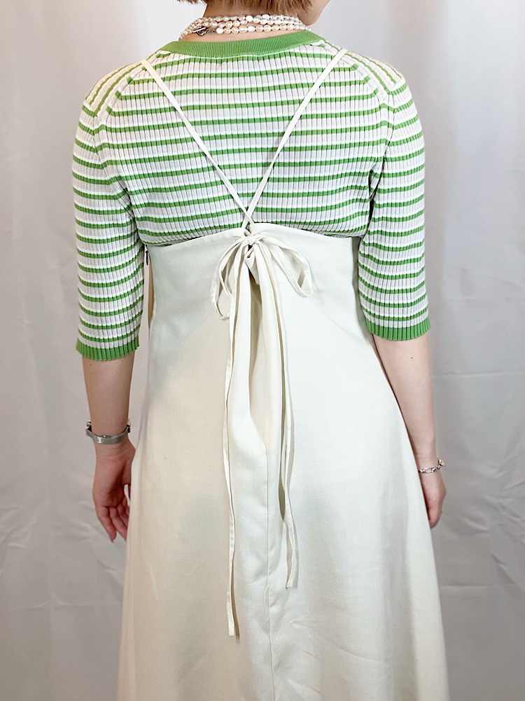 商品紹介:裾にかけて広がるシルエットなので楽に着ていただけます。後の紐が調節可能なので、身長が高い方から小柄な方まで幅広く着ていただけます。