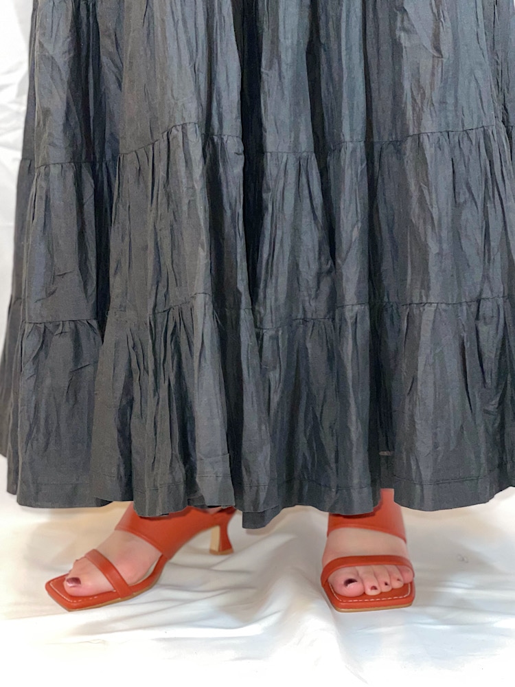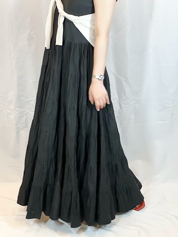 商品紹介:スカート部分に布を沢山使っているので裾にかけての広がりが可愛いワンピースです。去年よりも裾の長さが短くなったので小柄な方でも着ていただけます。素材はコットン100%なので夏場でも涼しく着ていただけます。