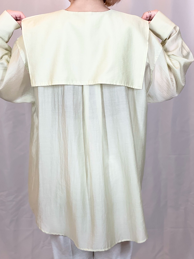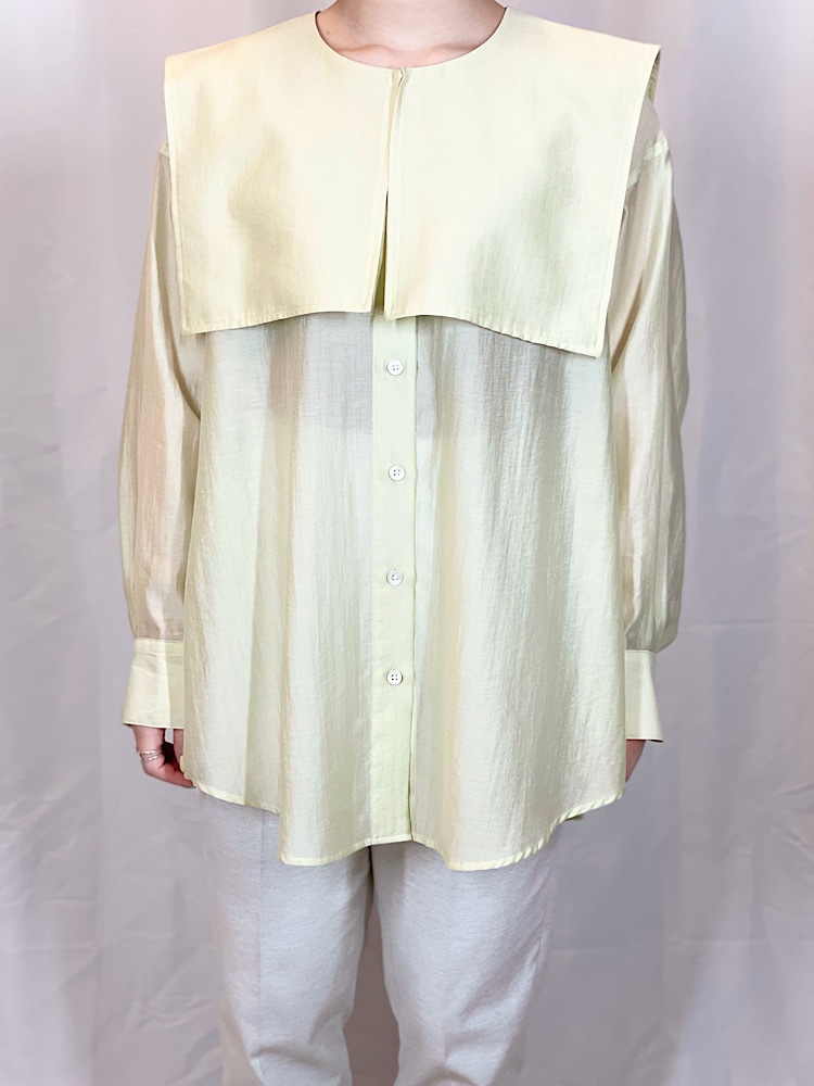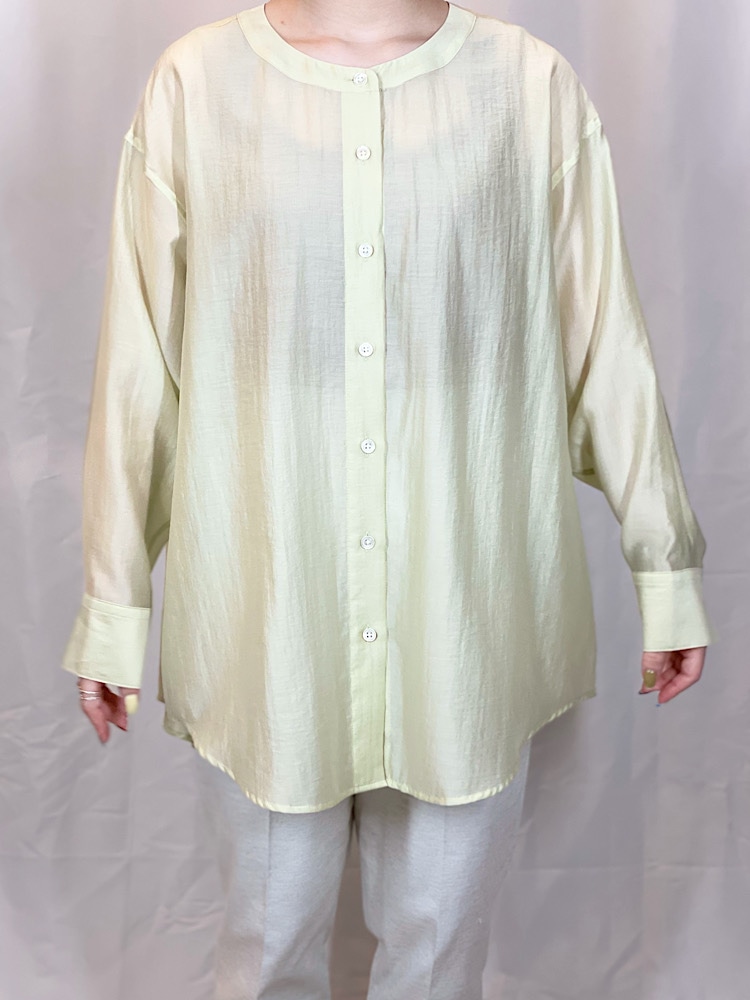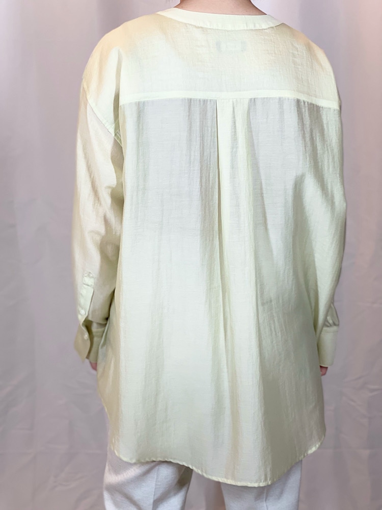 商品紹介:襟の取り外しが可能なシアーシャツです。襟の取り外しができるので、取り外していただくとバンドカラーシャツとしても着ていただけます。色々な着方ができるので着回しがしやすいアイテムとなっております。