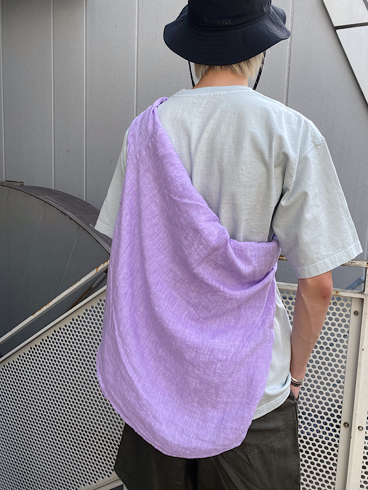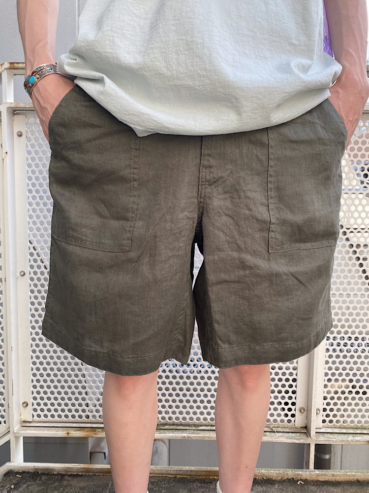 ショーツ、シャツを麻生地で合わせた夏コーディネートです。足元を白スニーカーにして清潔感を出し、差し色にラベンダーカラーのシャツを使いました。