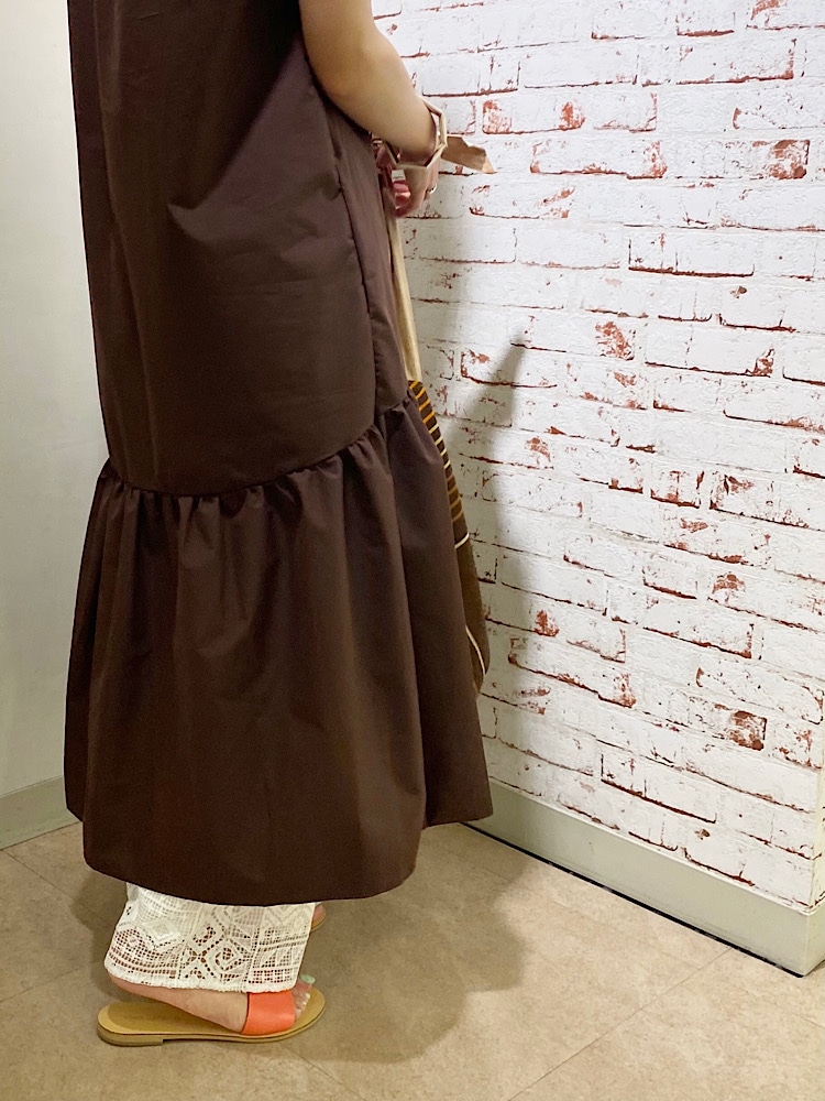 裾のディティールがポイントのワンピースにレースのパンツをレイヤードしました。可愛くなりすぎないようパンツを取り入れ、カジュアルなスタイリングにしました。
