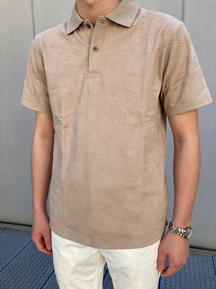 素材感・着心地:ジャガード機でリーフ柄を表現。鹿の子や天竺とは違った表情で一枚着やジャケットのインナーにも最適。マリン感があり、より夏らしい印象になる。