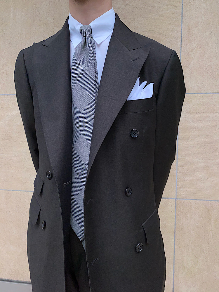 タイのシックな配色とパターンに、スリーピークスで挿れたチーフがクラシカルムードを更に加速させる。