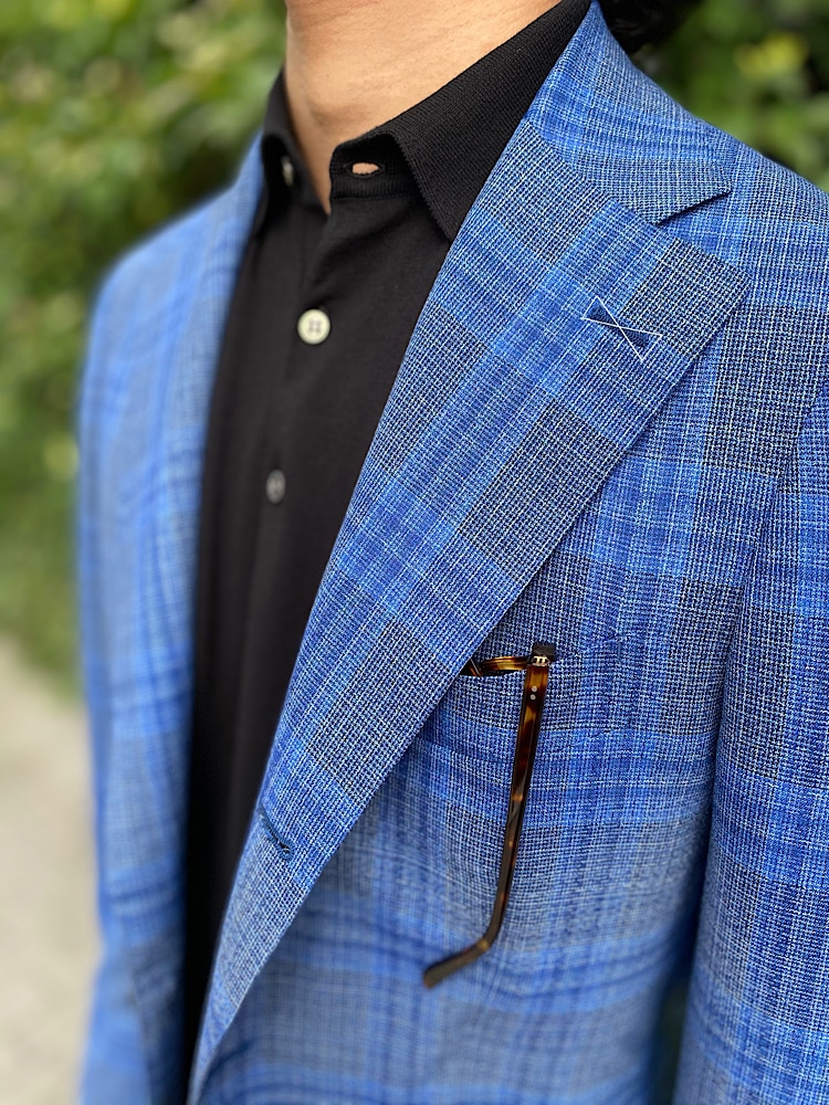 ブラックベースにブルーのジャケットを羽織り柔らかさを出した男らしいスタイル。