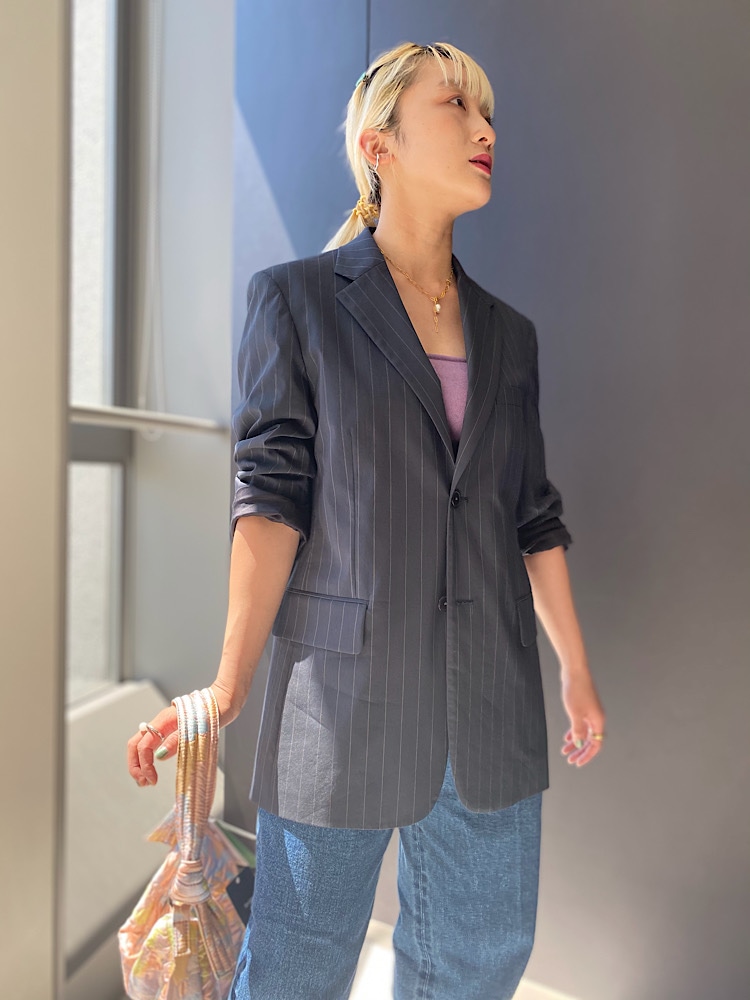 着こなしポイント:かっちりとしたジャケットとヒールを着用したので、あえてLサイズをチョイス