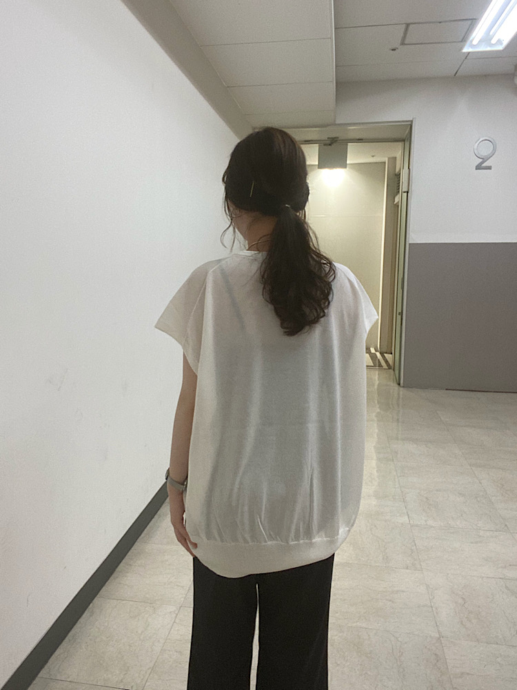 サイズ感:身幅も着丈もゆったりとしたシルエットです。ノースリーブですが、二の腕は隠れるほどのゆったりさがあります。