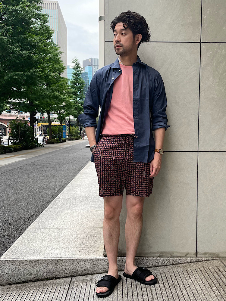 ショーツ&サンダルコーデ。色をまとめて大人な雰囲気に。