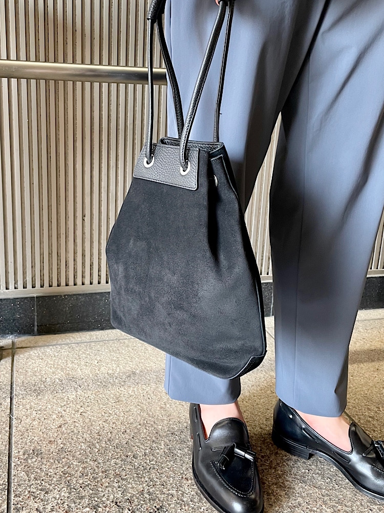 Lサイズでゆったりとしたサイズ感です。ジャストで履く場合はMサイズがいいと思います。ややゆったりとしたのテーパードシルエットで足のラインが綺麗に見えます。セットアップのジャケットと一緒に着て頂くのがおすすめです。