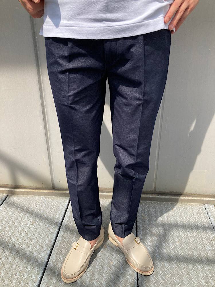 素材感・着心地: コットンとポリエステルの混合生地。デニムライクな生地になっており、カジュアルシーンからオンシーンでのお使いが可能。またプリーツ入りでテーパードが綺麗にかかっている。SET UPのジャケットもあり。