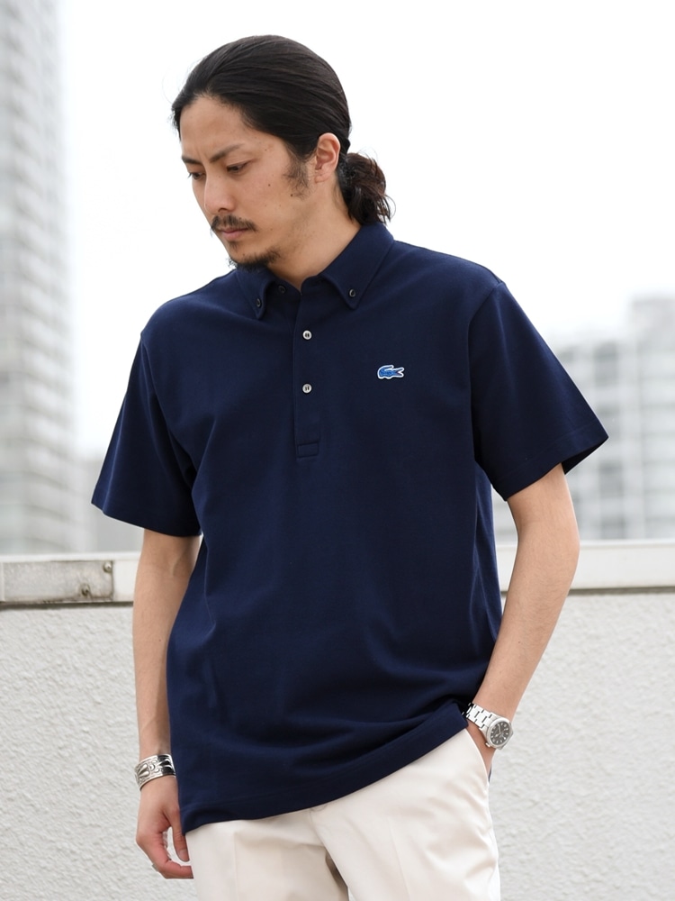 LACOSTEのクラシックなボタンダウンポロに爽やかなコードレーンスラックスを合わせたビジカジスタイル