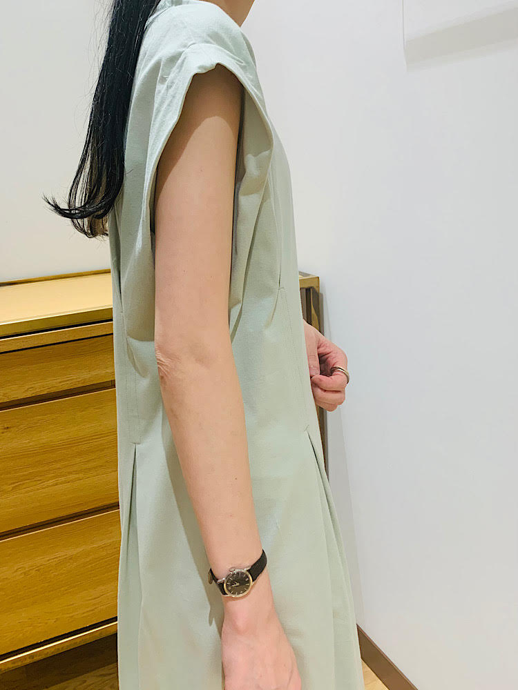 サイズ感:袖はフレンチスリーブぐらいで、二の腕がシャープに見えます。身頃は、ゆったりの割に、タックありスッキリ!