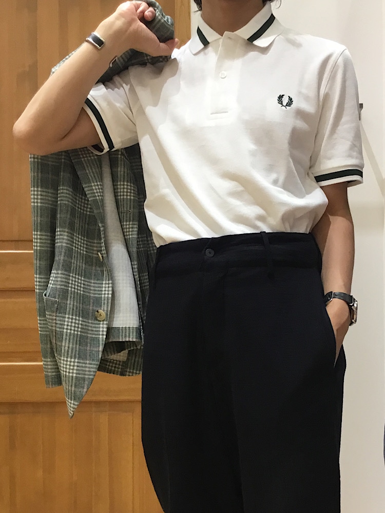 ジャケットを脱がれても格好がつくようにインナーでワンポイントデザインのポロシャツをチョイスしております。