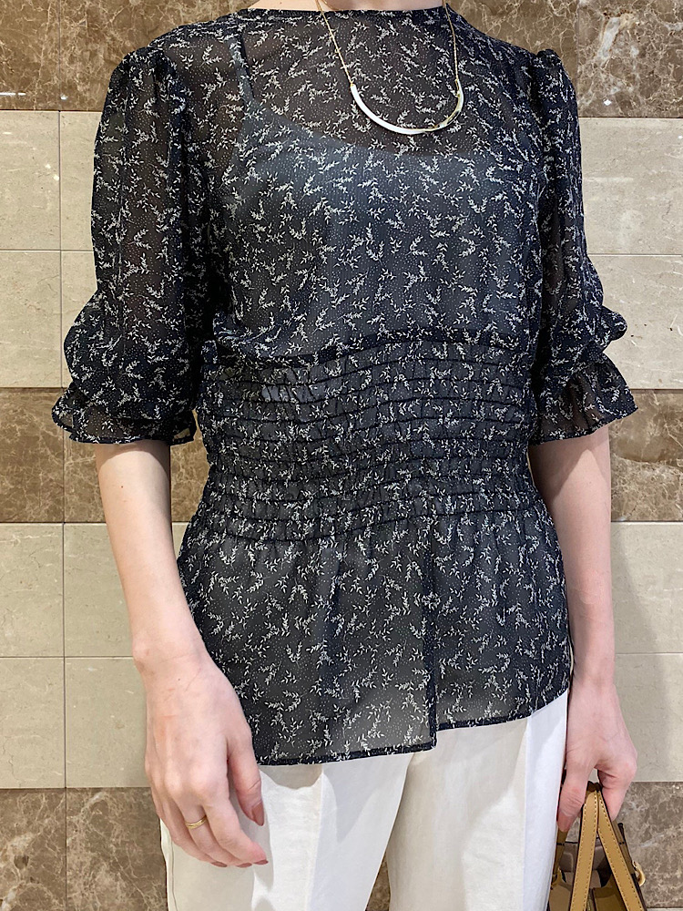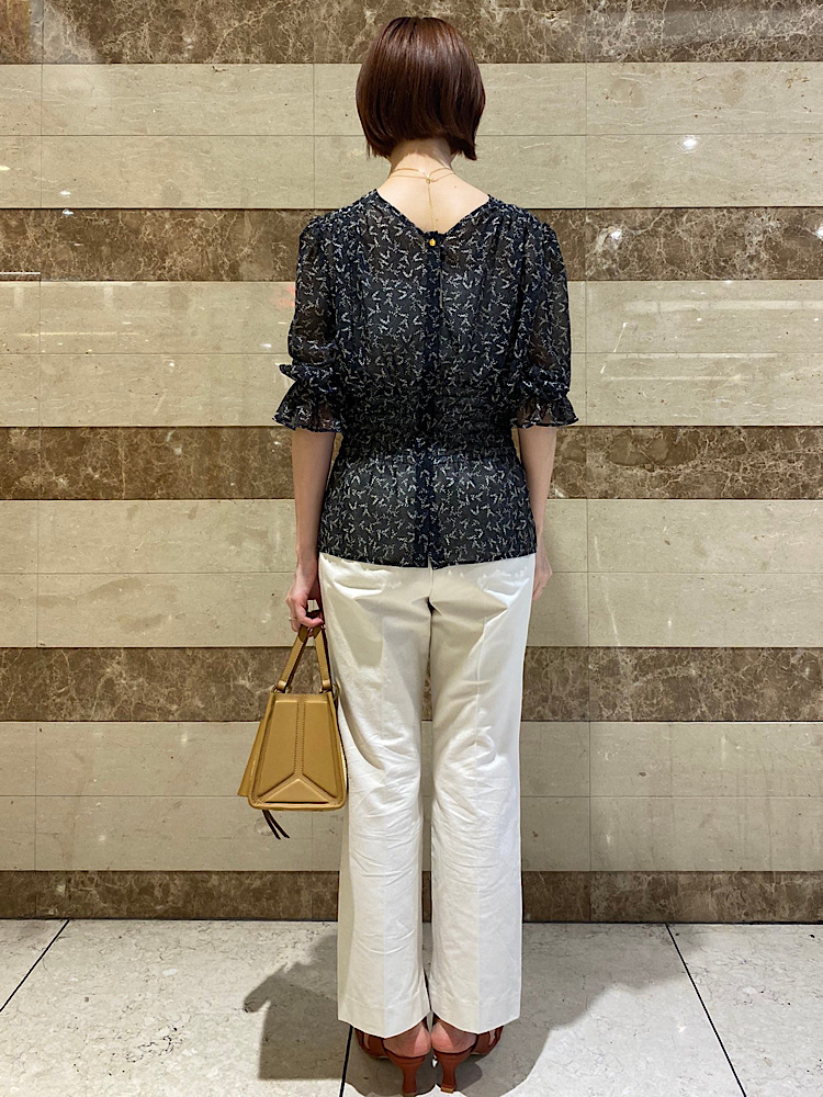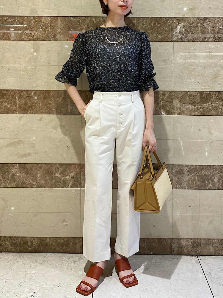 女性らしいブラウスはパンツでヘルシーな雰囲気を。