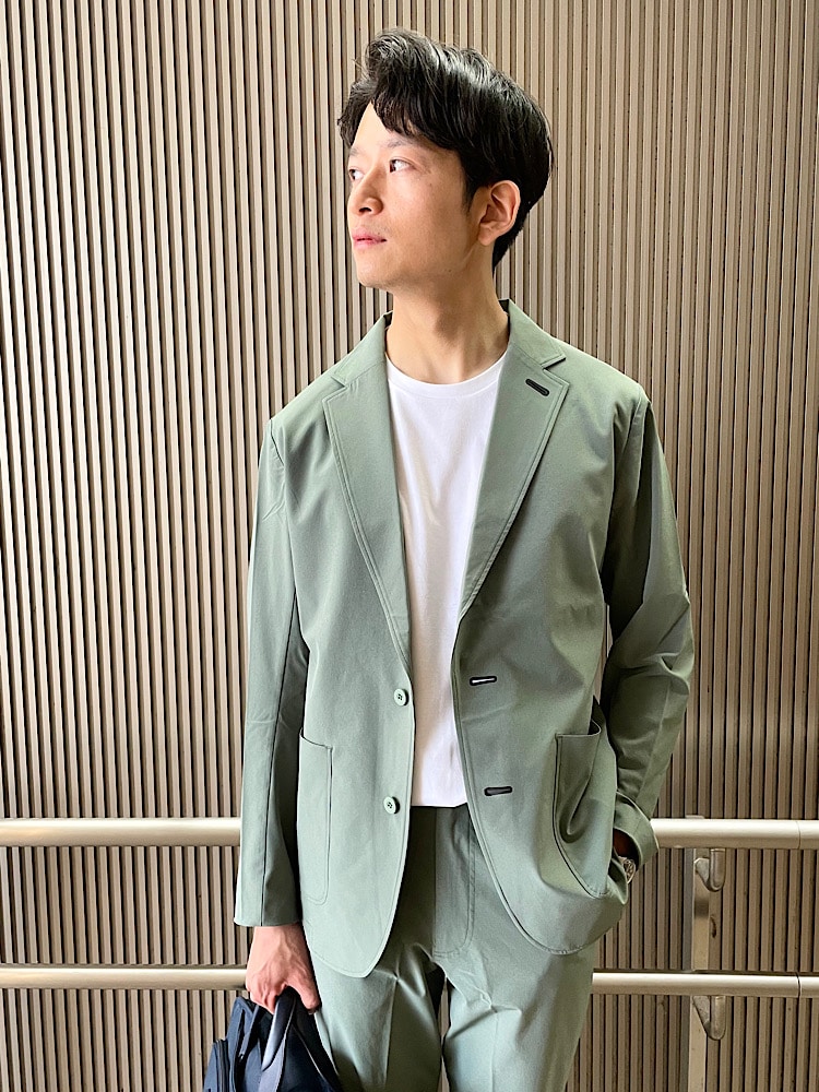 Mサイズで袖は少し長いですが、それ以外はジャストで着用できます。伸縮性のある素材感で、快適に着ていただけます。