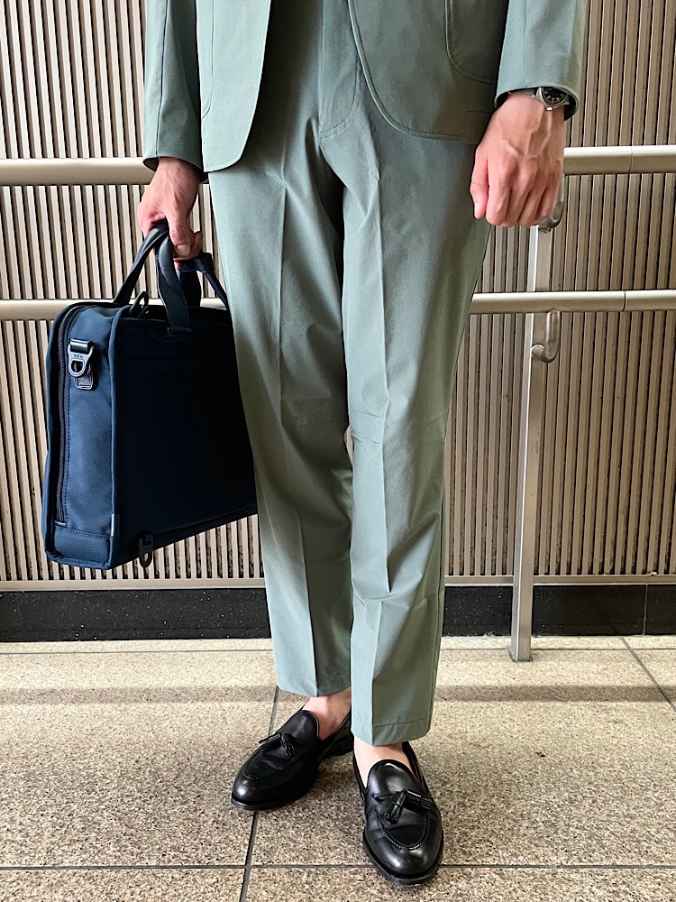 Mでジャストサイズです。細めの形でスマートな印象です。裾は短めですっきりとした印象ですが履けます。