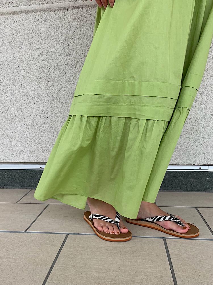 綺麗色のグリーンのスカートにプリントTEEで大人カジュアルなコーディネートに。