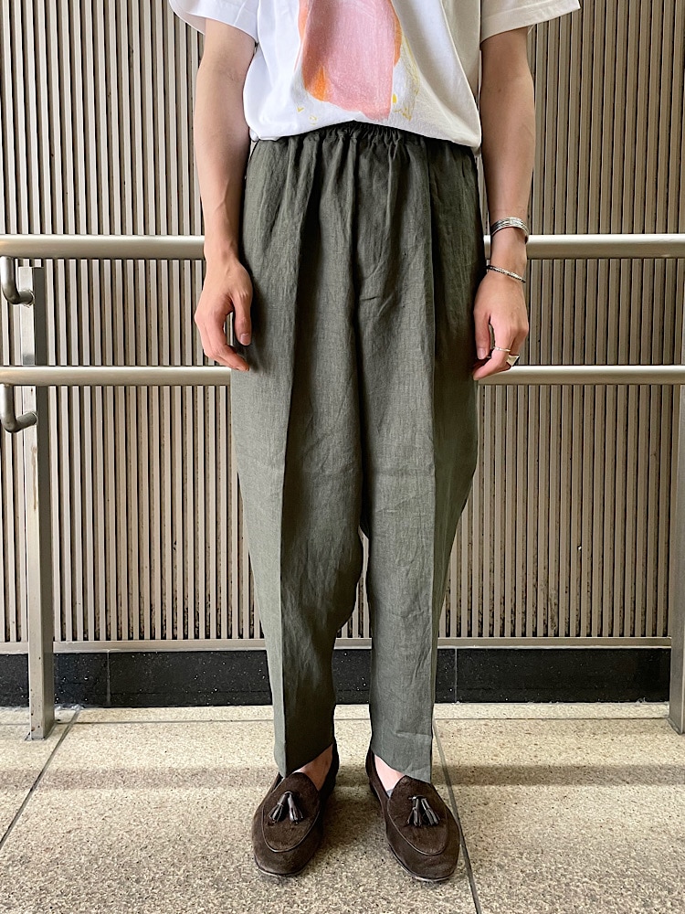 麻素材ですが、パリッとし過ぎず、柔らかな生地感です。イージーパンツ使用でとても履きやすいです。