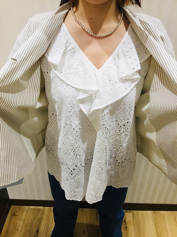 ◆着用アイテム:<手洗い可能>レースフリルVネック ホワイトブラウス