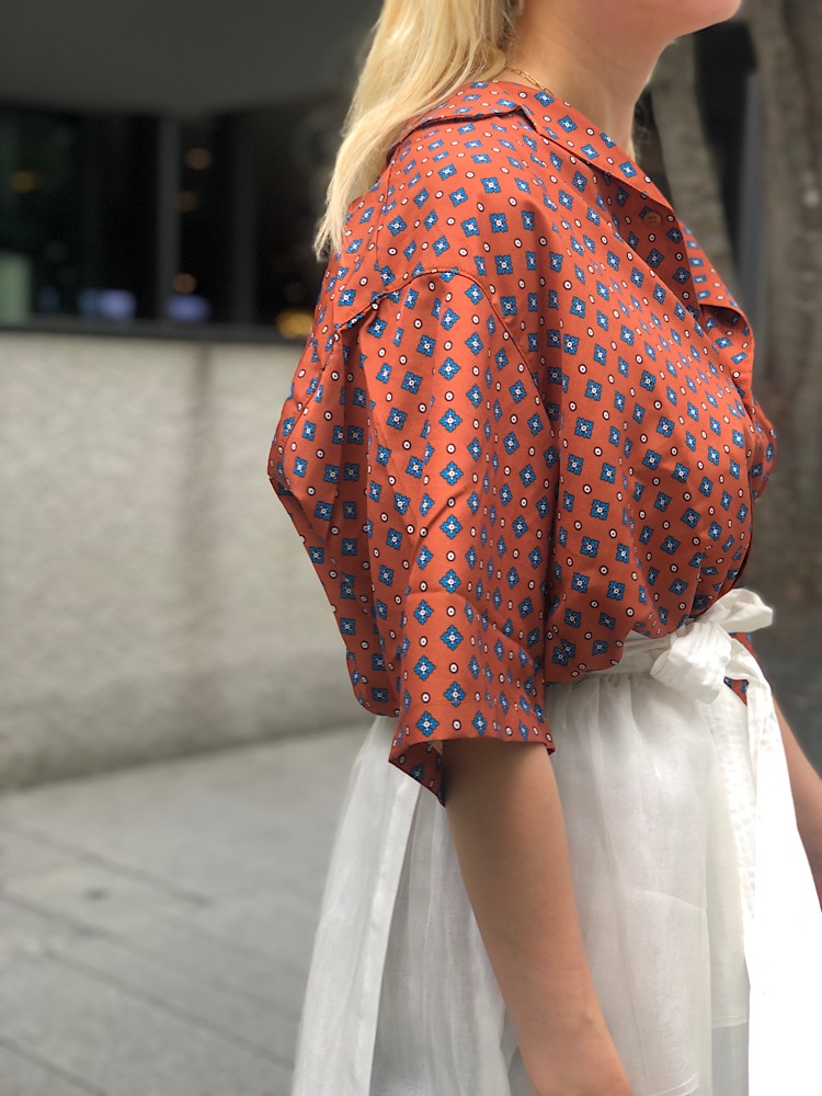 着こなしポイント:ゆったりとしたサイズ感なので、スカートにインして、さらには肩を抜く感じがおすすめです