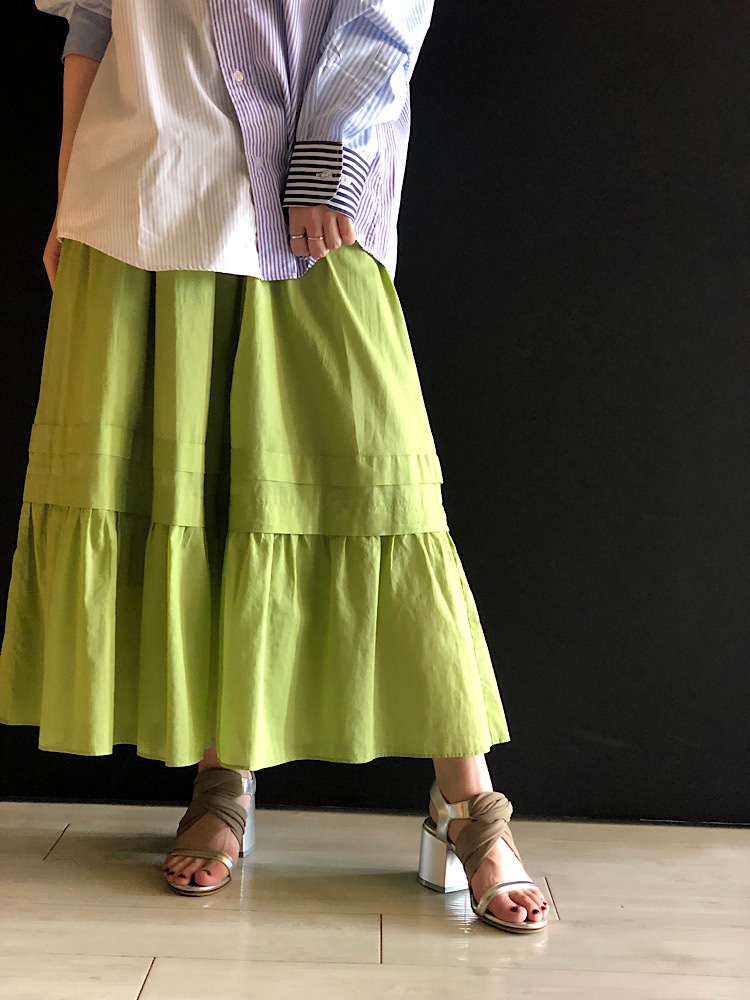 女性らしいティアードスカートをメンズライクなビッグシャツで甘くなりすぎないように