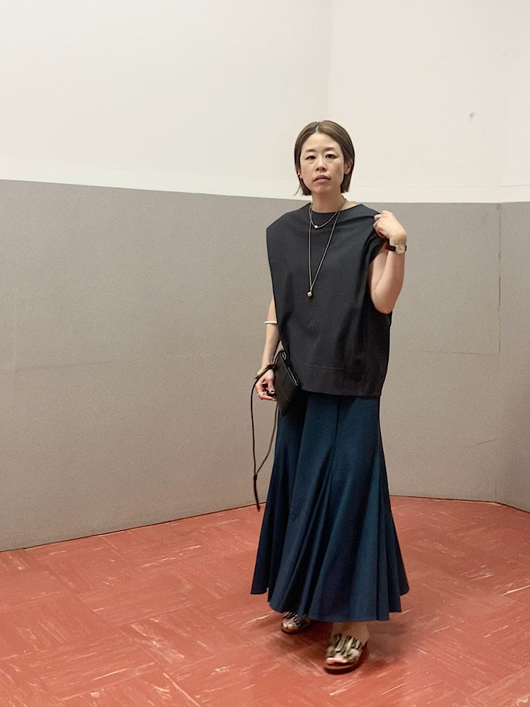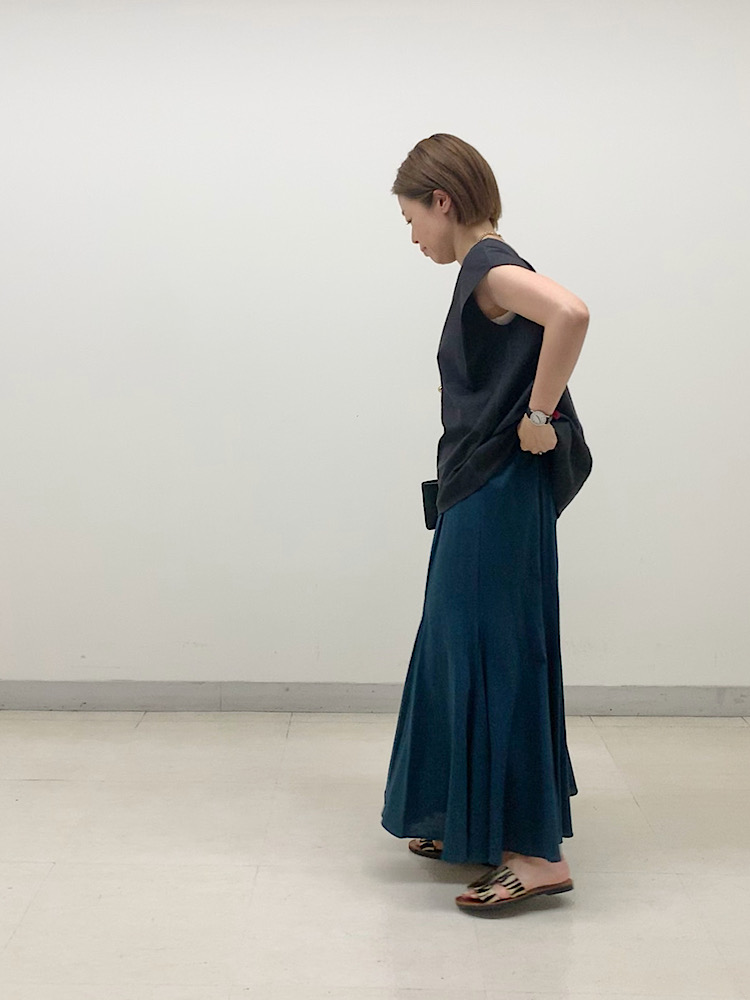 【素材感・着心地】シャリ感はあるが柔らかい風合い。たっぷりとしたフレアだが、とにかく軽い。ウエスト周りはゴムも入っているが、素材自体のストレッチ性が高くストレスフリー。