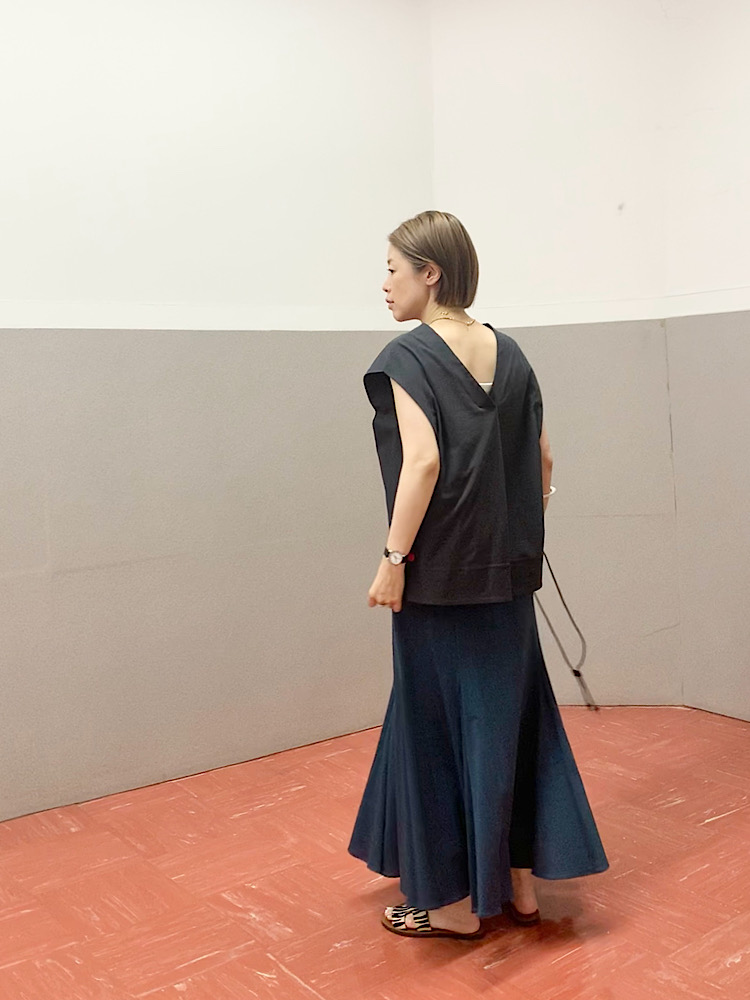 【素材感・着心地】ポロシャツのような素材感でさらさらした風合い。首元、腕周りの露出も大きすぎず、涼しく着られる。