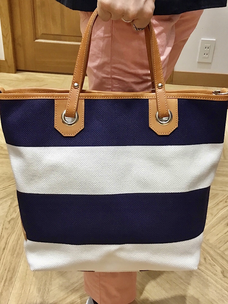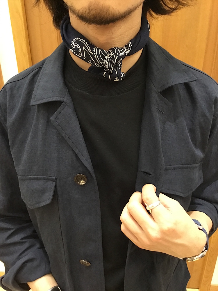 サファリジャケットスタイリング。マリンのテイストも加えたカラーリングとバッグセレクト、サファリジャケットとシューズの素材感をリンクさせるのがポイントです。