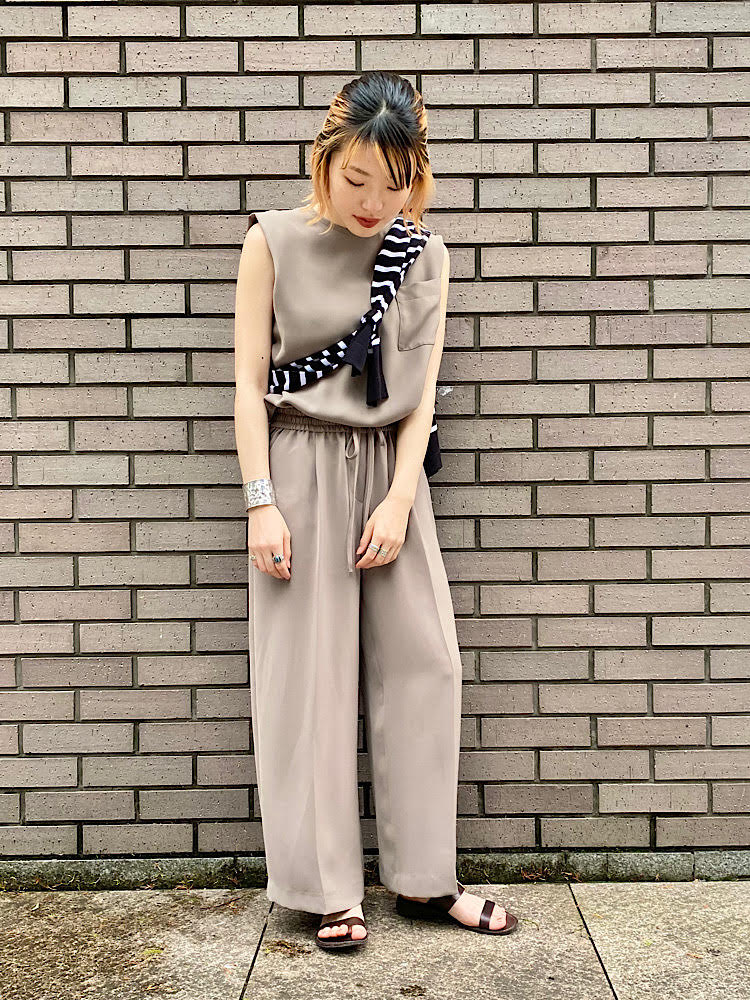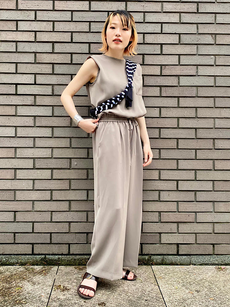 斜め掛けして、少しこなれ感のあるコーディネートに