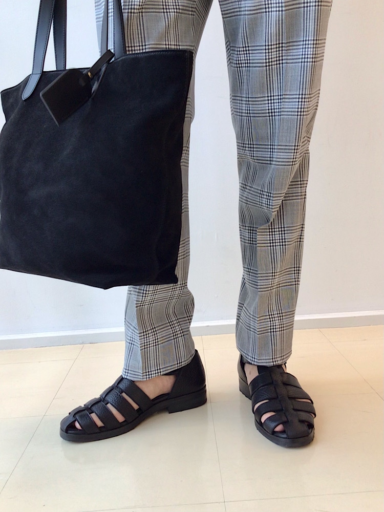 軽い生地感のセットアップ・スーツにリネンシャツとサンダルで涼しげに。