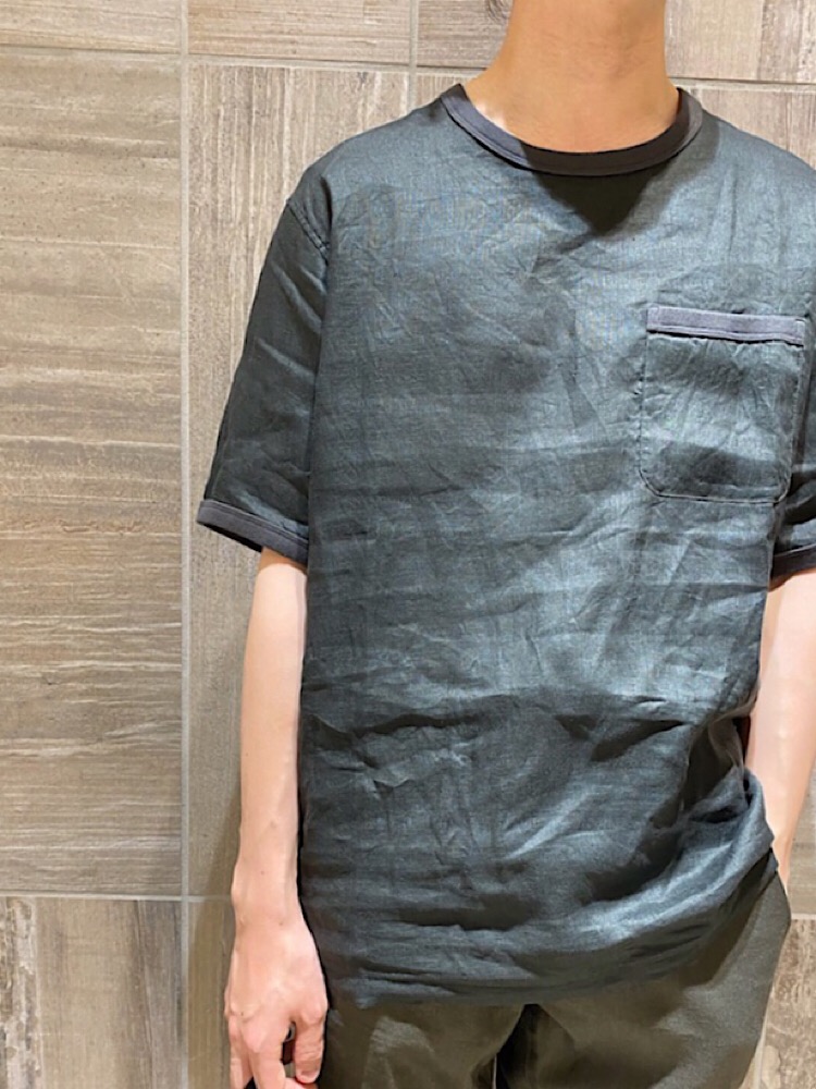 【素材感・着心地】麻素材で軽さ、清涼感があります。ゆとりあるサイジングで、リラクシングスタイルに合わせやすいと思います。ゆったりめなパンツにサンダルを合わせるのがオススメです!
