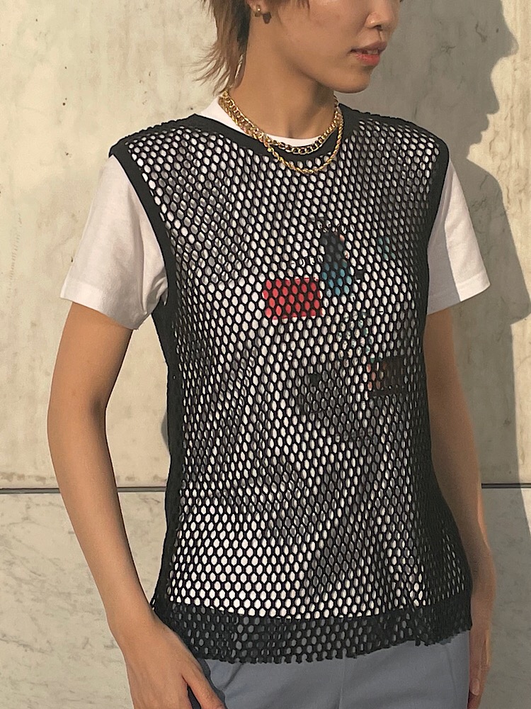 綿100%で肌馴染みが良いです。胸元のデザインはアートディレクター/グラフィックデザイナーの吉田昌平さんが手がけたコラージュをプリントしており、カラフルなお色がどんなボトムスとも相性がいいです。