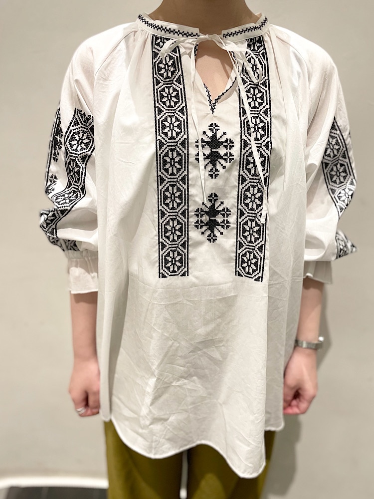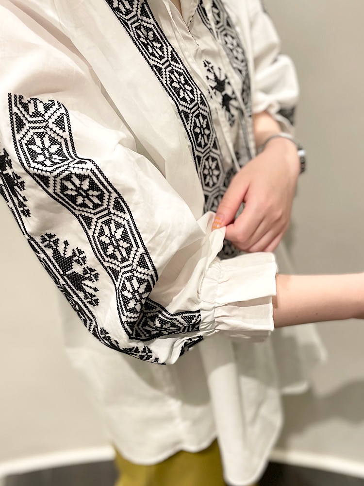 商品紹介:前身頃と袖部分にある刺繍がアクセントになっているブラウスです。首元のリボンは垂らして着ても可愛いです。袖がゴムになっているのでまくって袖にボリュームをだして着ても可愛いです。長すぎない丈感なので出してきてもインして着ていただいてもバランスよく着ていただけます。